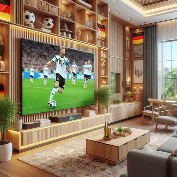 Phòng khách luôn được dọn dẹp gọn gàng, ngăn nắp, tạo cảm giác thoải mái và tập trung khi xem bóng đá. Cờ quốc gia Đức với màu sắc riêng biệt được treo ở nhiều vị trí mang cảm giác rộn ràng, nhiệt huyết và đam mê.