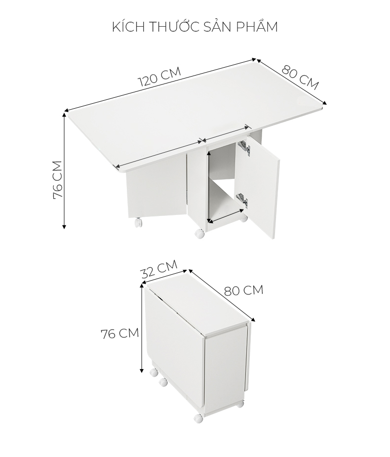 - Kích thước mở rộng: Dài 120cm x Rộng 80cm x Cao 76cm
