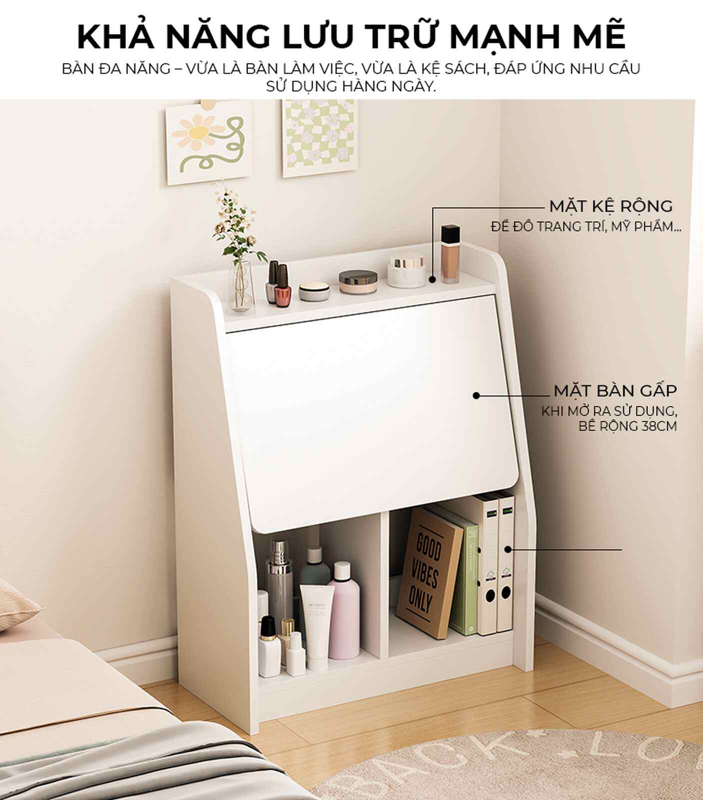 - Đa năng vượt trội: Vừa là bàn trang điểm, vừa là kệ lưu trữ đồ trang trí, mỹ phẩm hay sách vở.