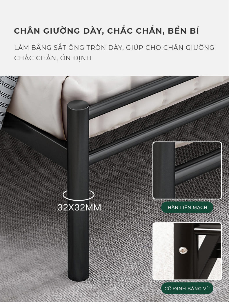 - Chân giường chắc chắn: Chân giường được thiết kế chắc chắn, đảm bảo sự ổn định cho giường.