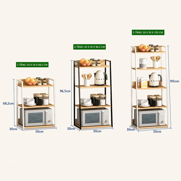 - Kích thước đa dạng: Kệ Kodo được thiết kế với 3 kích thước khác nhau (3 tầng, 4 tầng và 5 tầng) để phù hợp với nhiều không gian và nhu cầu sử dụng khác nhau. Kích thước cụ thể của từng loại kệ đã được ghi rõ trên hình ảnh.