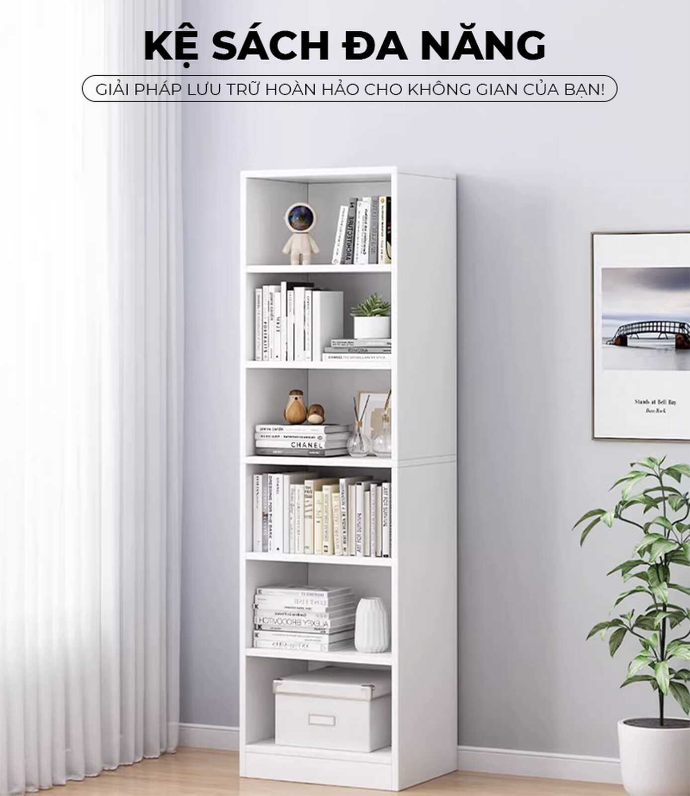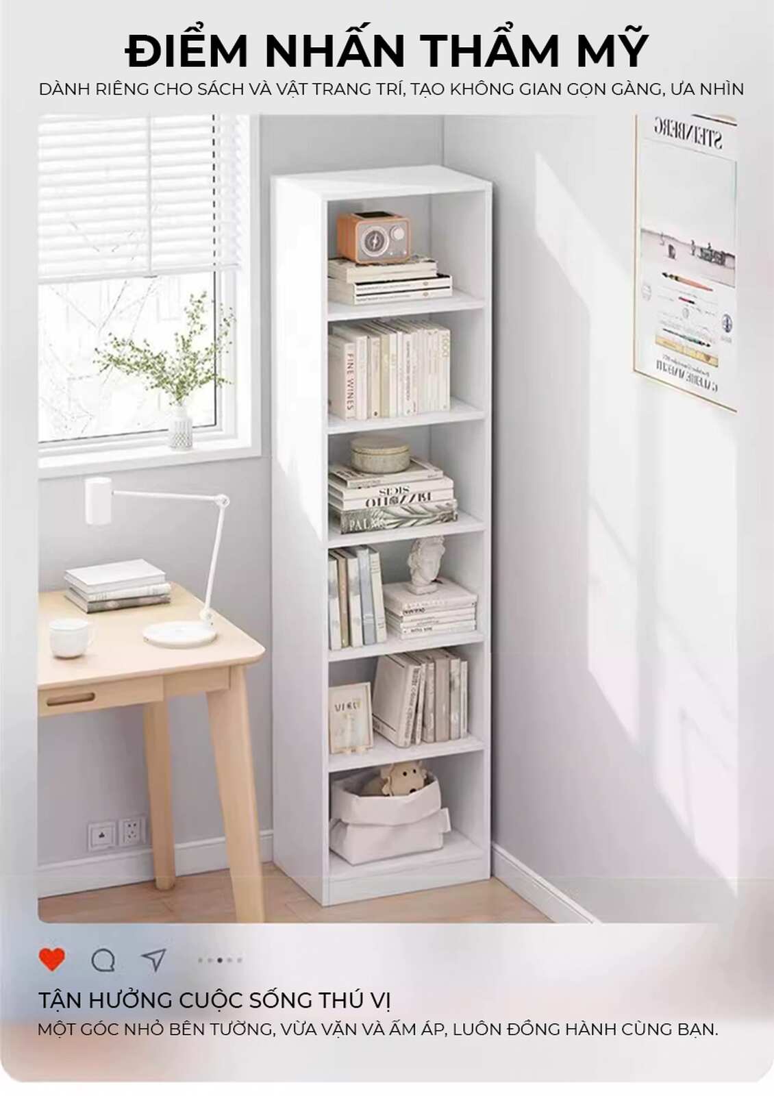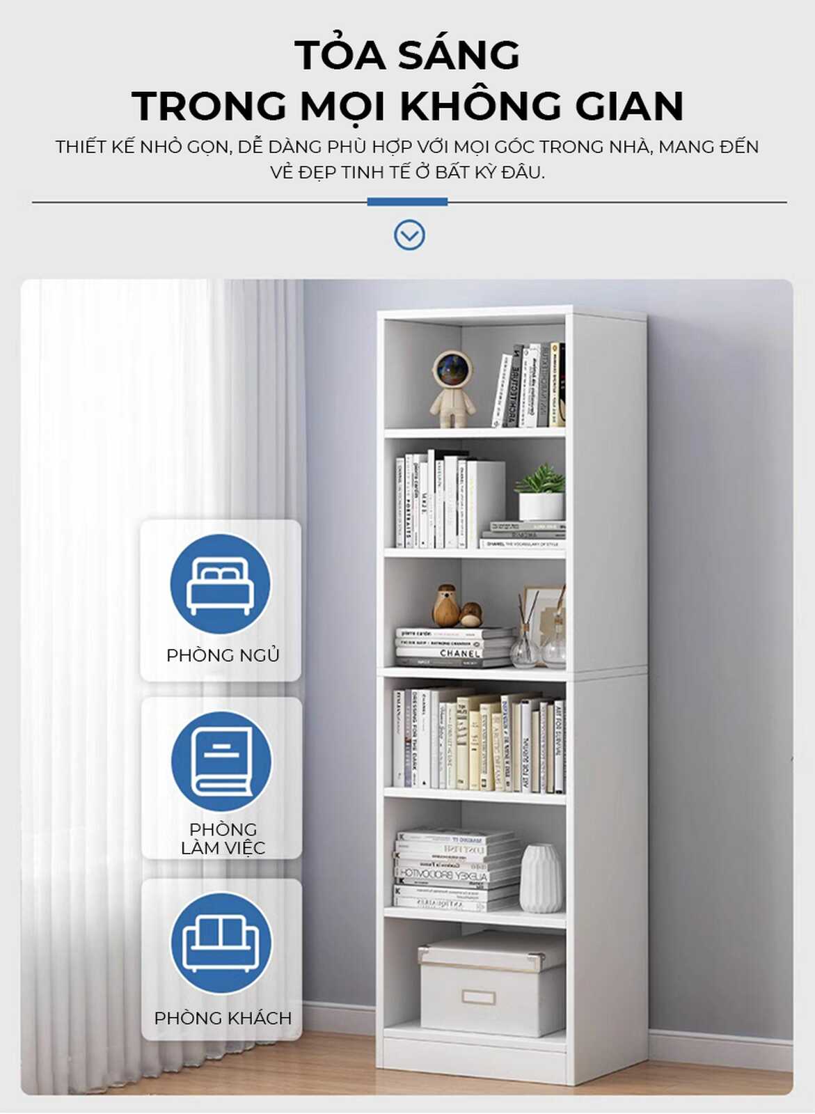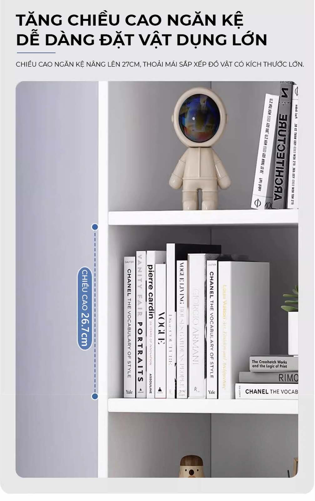 - Ngăn kệ cao 27cm: Thoải mái sắp xếp sách và đồ decor kích thước lớn mà không lo chật chội.