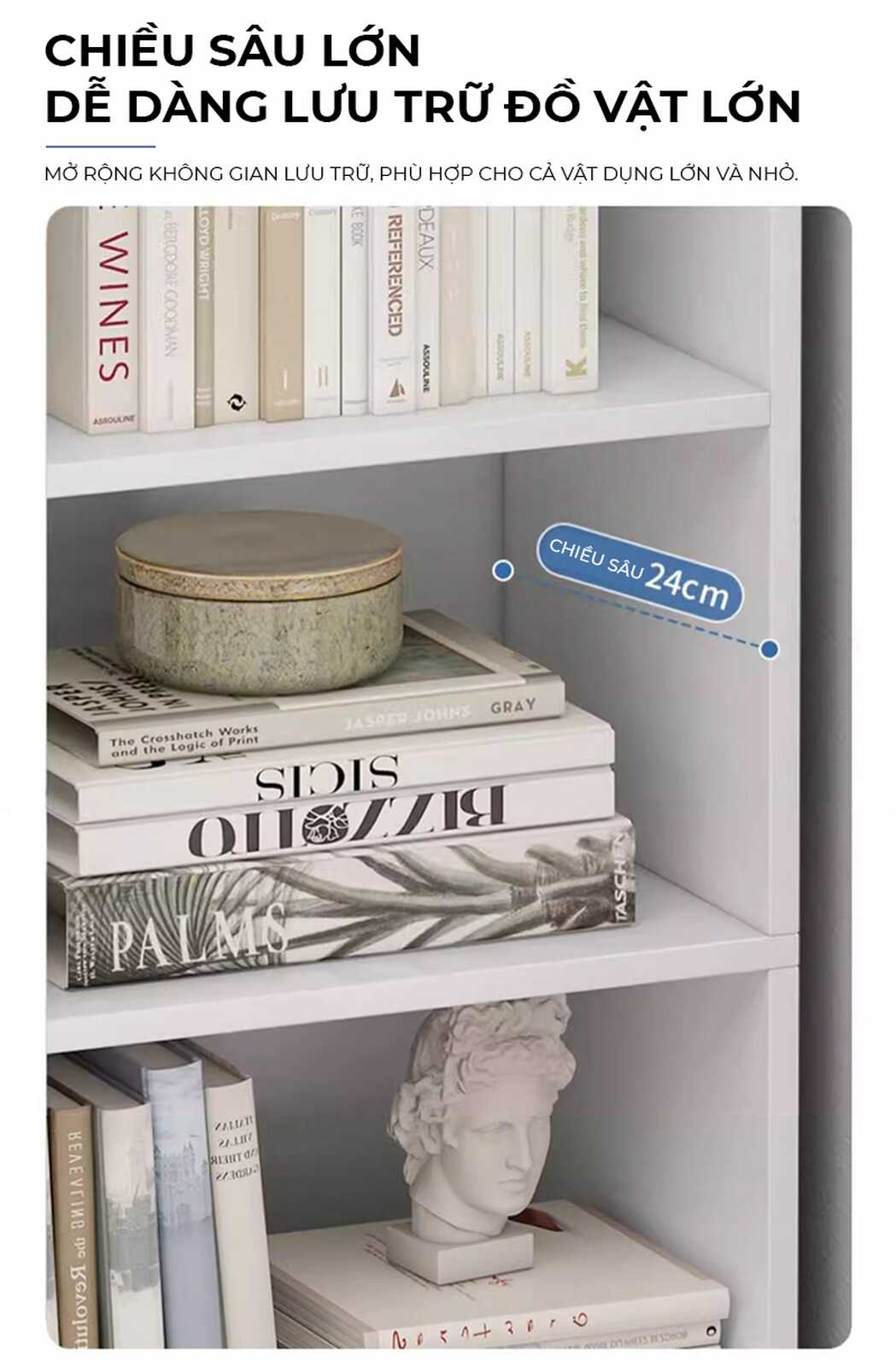- Chiều sâu lớn 24cm: Dễ dàng lưu trữ cả vật dụng lớn và nhỏ, tối ưu không gian sử dụng.