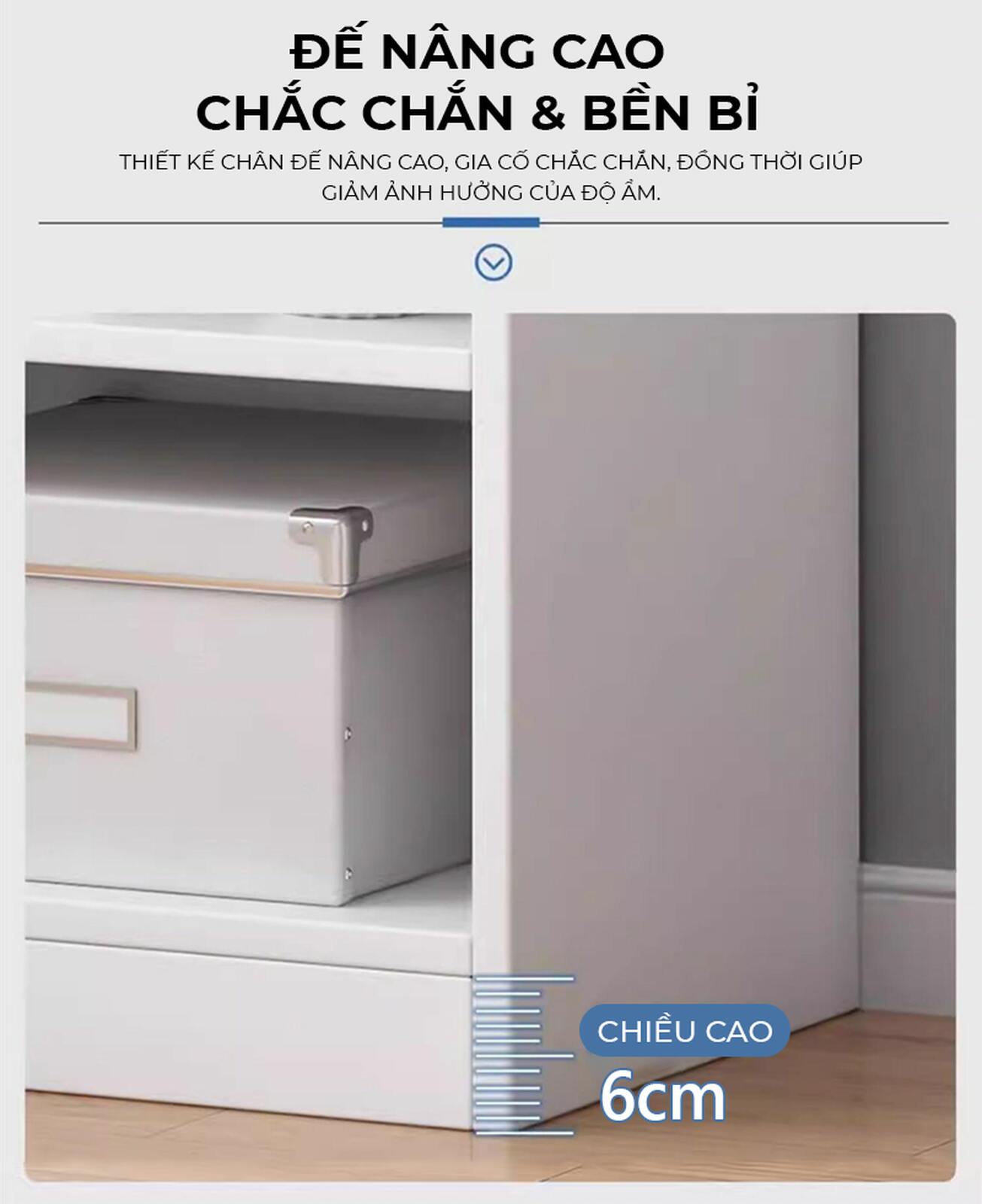 - Chân đế nâng cao 6cm: Chắc chắn, bền bỉ, giảm ảnh hưởng độ ẩm, bảo vệ đồ vật tốt hơn.