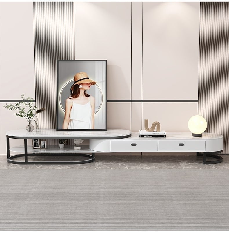 Kệ tivi hiện đại với thiết kế tinh tế, kết hợp hoàn hảo giữa mặt đá sang trọng và khung sắt chắc chắn. Đường nét mềm mại, bo tròn tạo điểm nhấn cho không gian phòng khách. Sản phẩm có ngăn kéo và kệ mở, giúp bạn dễ dàng sắp xếp, trang trí và cất giữ đồ đạc.