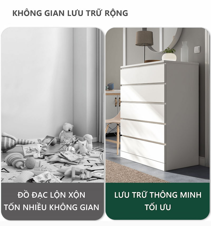 - Lưu trữ đồ đạc: Tủ đa ngăn gỗ MDF được thiết kế với nhiều ngăn kéo có kích thước khác nhau, giúp bạn phân loại và lưu trữ nhiều loại đồ dùng khác nhau như quần áo, đồ dùng cá nhân, sách vở, đồ trang trí,... Nhờ đó, căn phòng của bạn sẽ luôn gọn gàng và ngăn nắp.