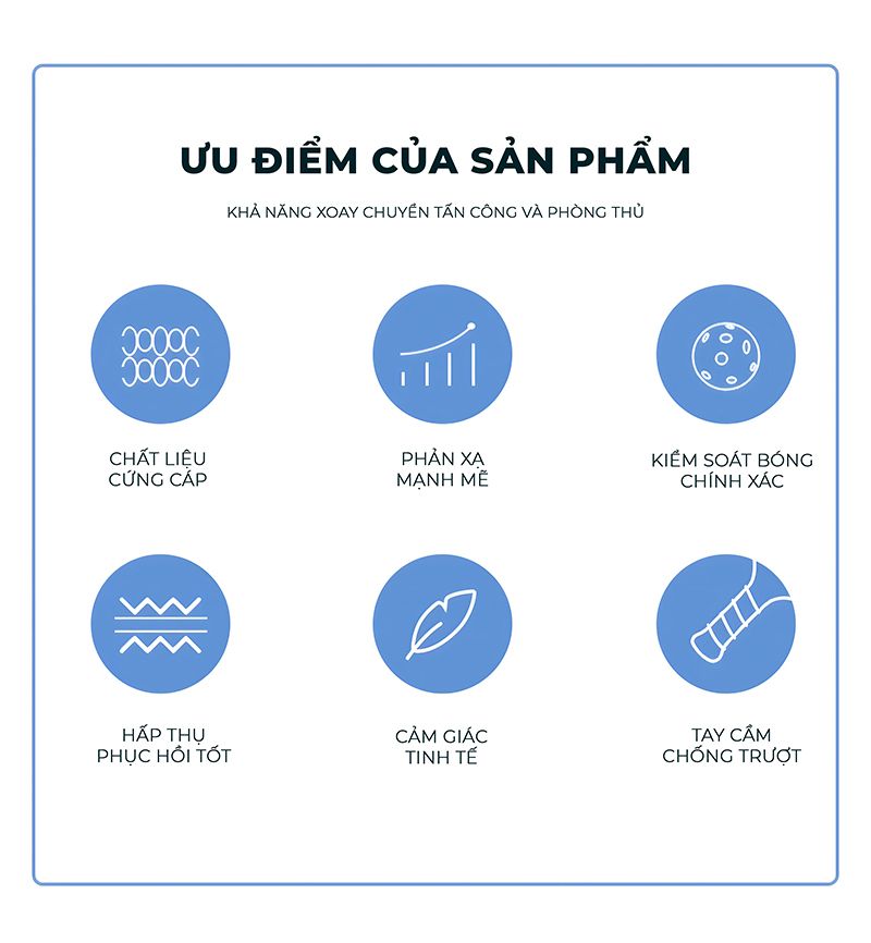 - Cán vợt: Cán vợt được làm từ chất liệu giúp tạo độ cân bằng và thoải mái khi cầm nắm.